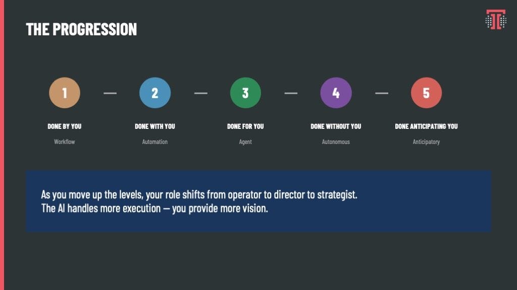 Done by you. Done with you. Done for you. Done without you. Done anticipating you. Five levels. Let me walk through each one.